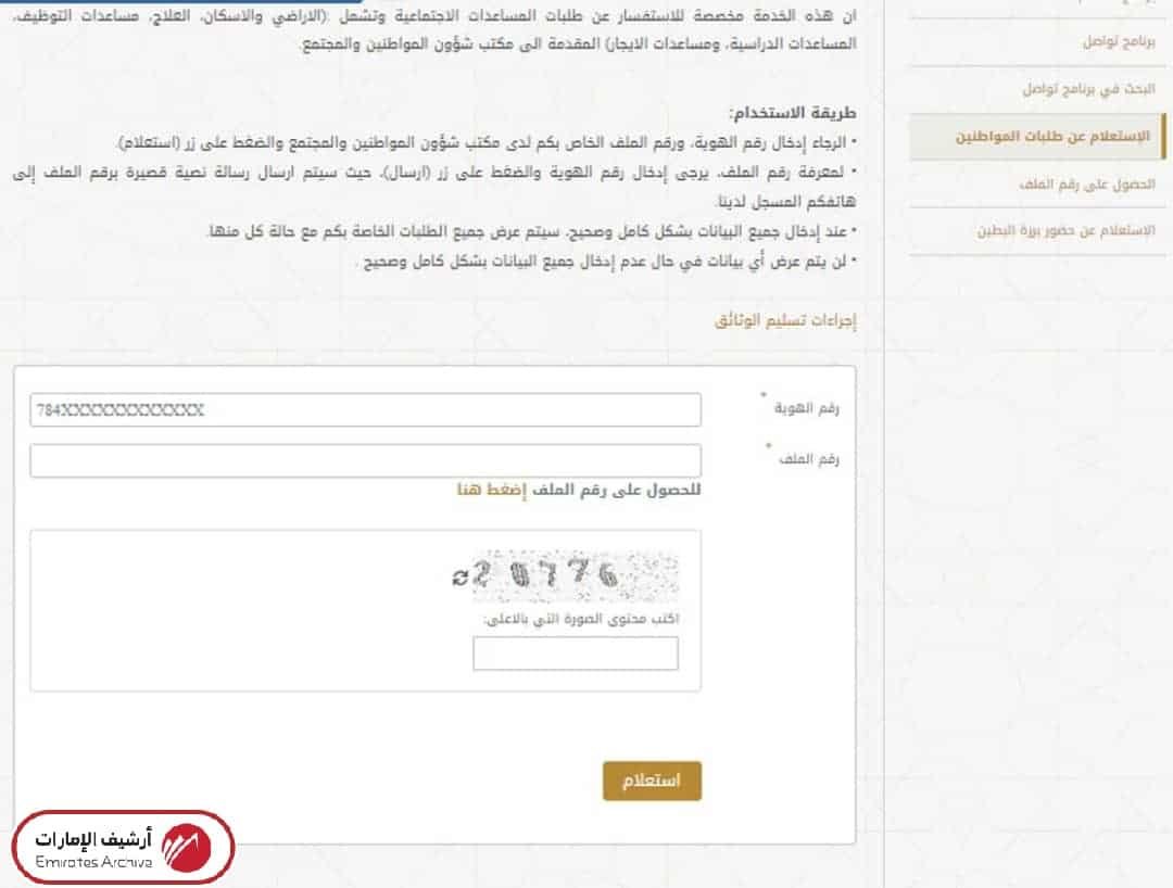 يمكن الاطلاع على حالة الطلب في ديوان الرئاسة عبر زيارة صفحة الاستعلام عن طلبات المواطنين على الموقع الرسمي، ثم إدخال رقم الهوية الإماراتية ورقم الملف المرتبط بالطلب، والنقر على خيار استعلام لعرض تفاصيل حالة الطلب فورًا.