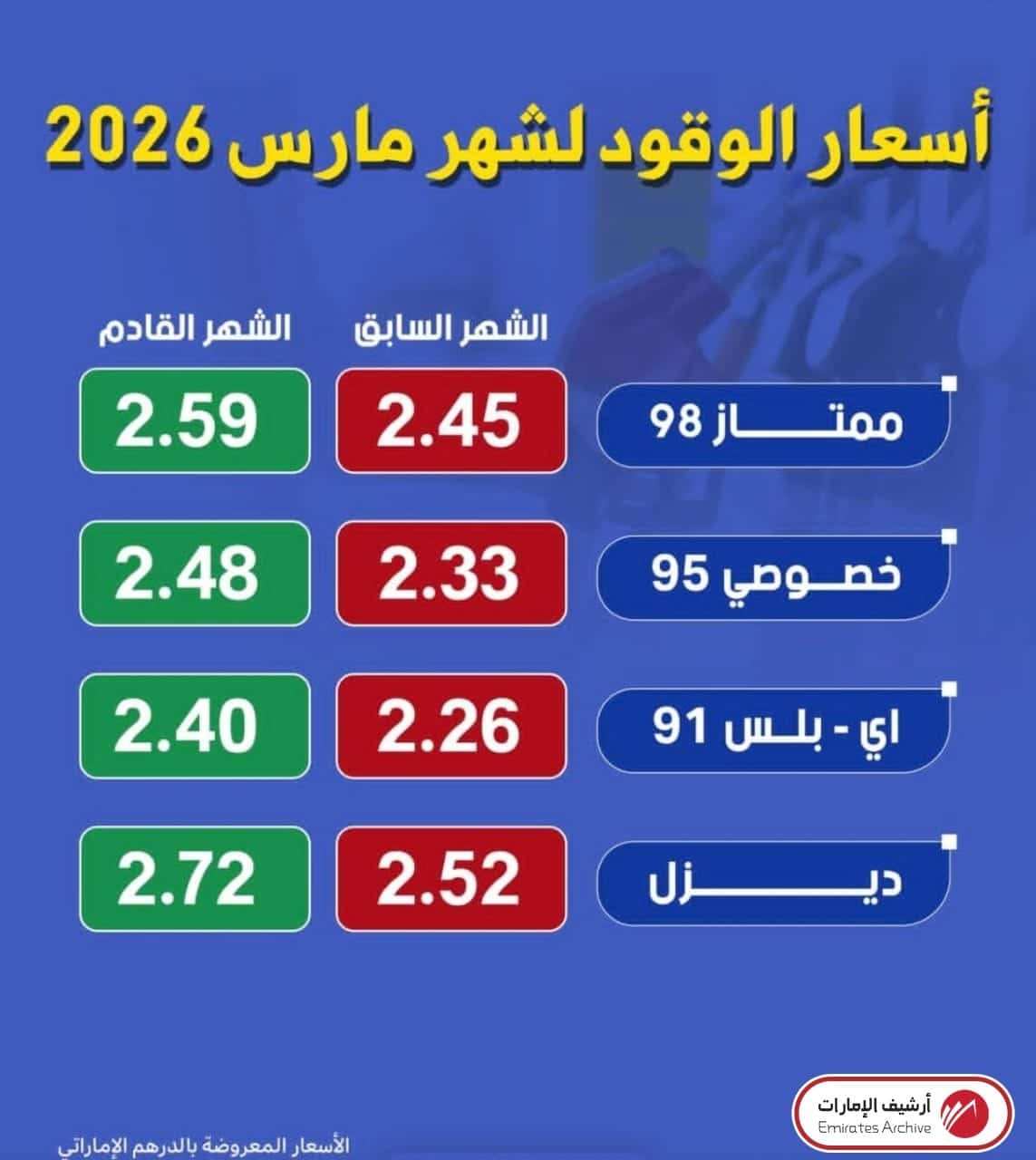 يبين الجدول الآتي أسعار الوقود في الإمارات لشهر مارس- أذار 2026 وفقًا للمراجعة الشهرية لأسعار الأسواق العالمية:[1]