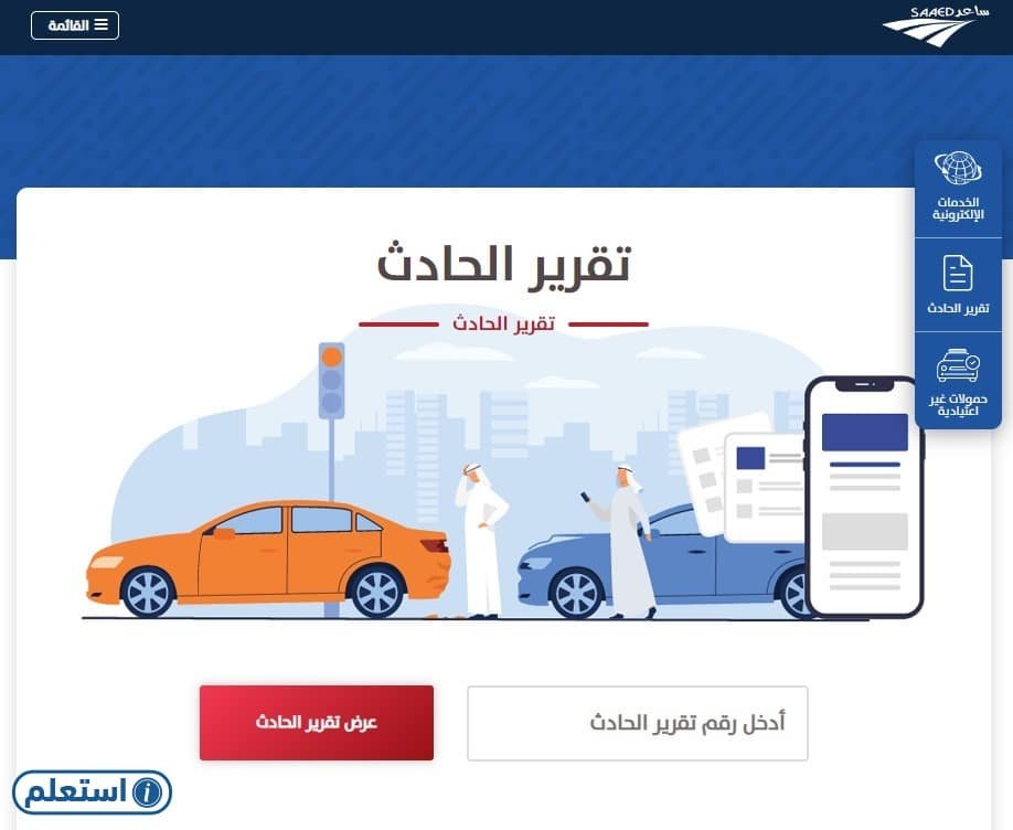 يتم الاستعلام عن تقرير حادث مروري عبر الموقع الإلكتروني لساعد للأنظمة الإلكترونية باتباع الخطوات الآتية:[1]