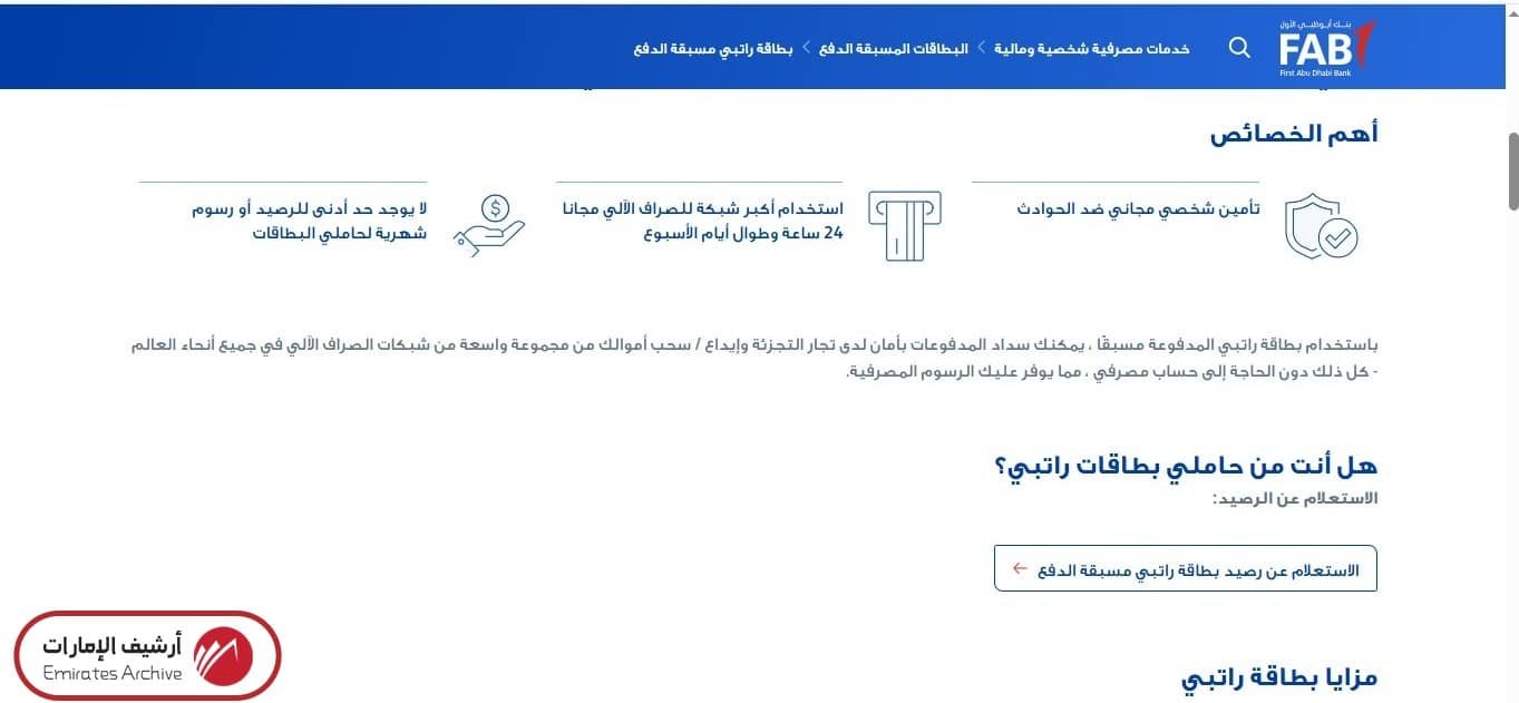 يمكن الوصول المباشر إلى خدمة “الاستعلام عن رصيد بطاقة راتبي مسبقة الدفع” عبر موقع بنك أبوظبي من خلال الرابط التالي: https://www.bankfab.com.