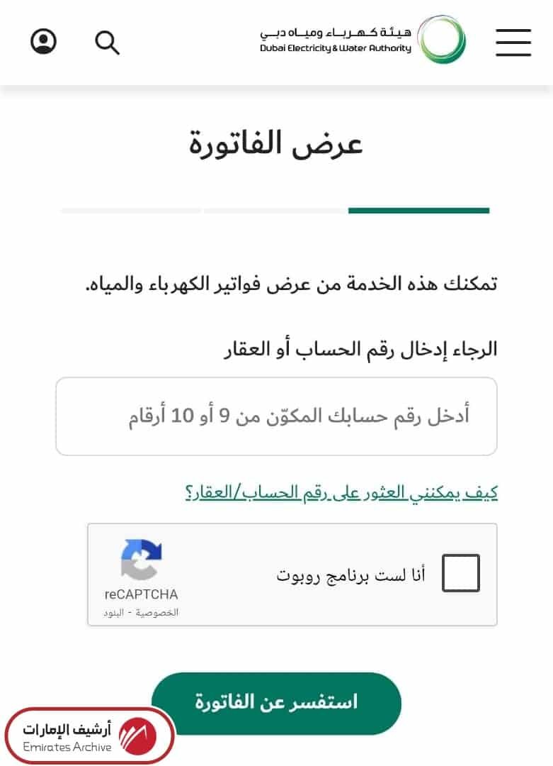 - يُنصح الانتقال المباشر إلى خدمة عرض الفاتورة عبر الموقع الرسمي لهيئة كهرباء ومياه دبي لضمان سرعة الخدمة.