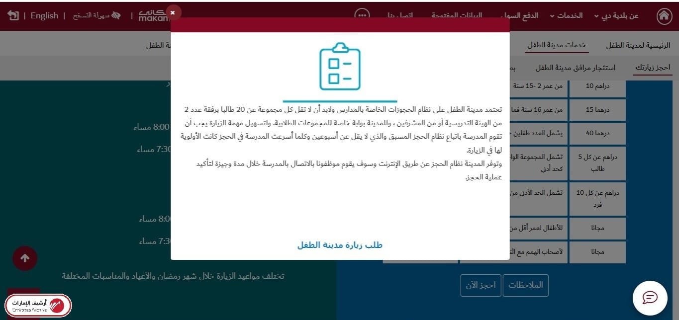 - الضغط على أيقونة “احجز الآن”، من ثم قراءة تعليمات زيارة مدينة الطفل.